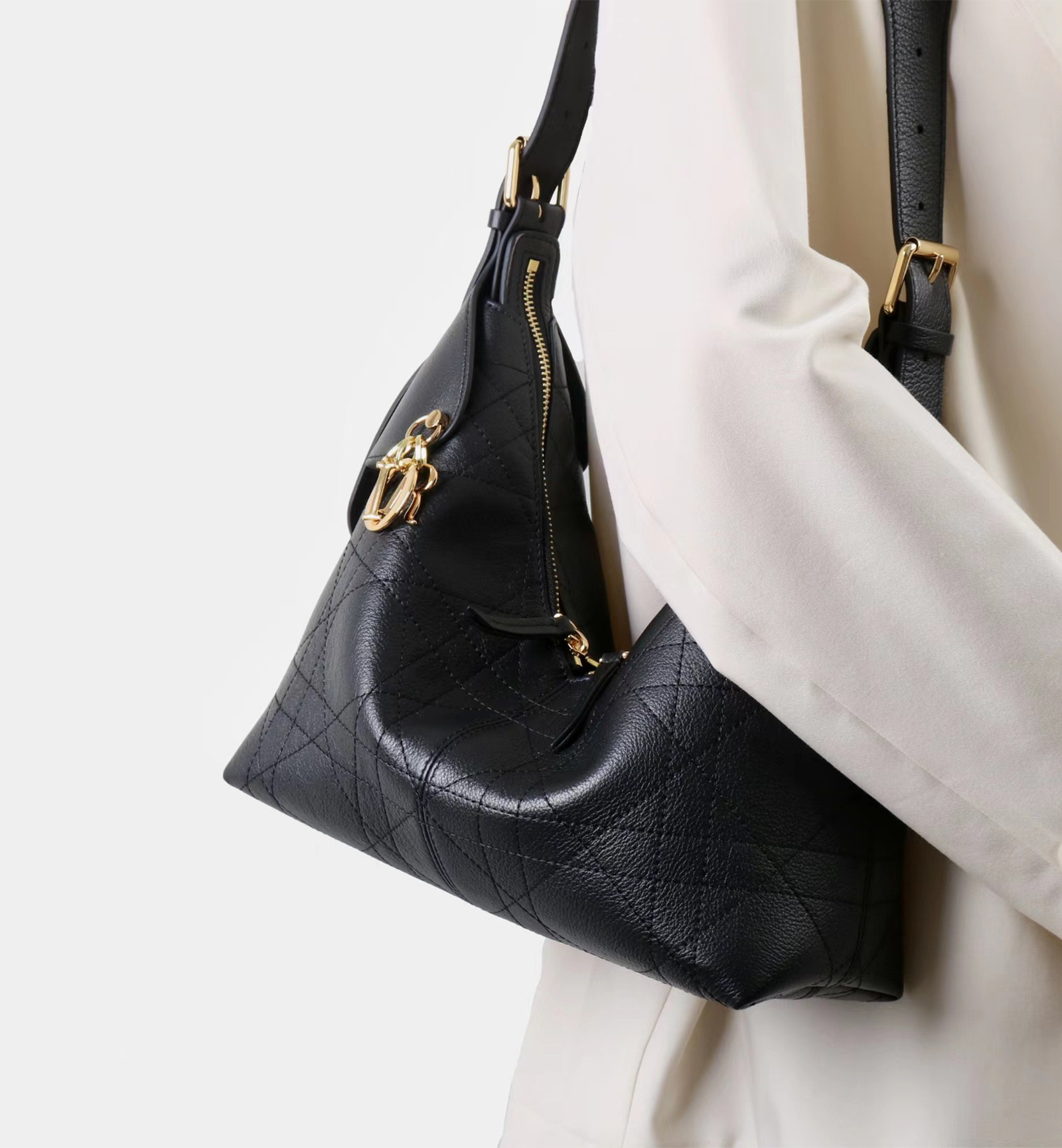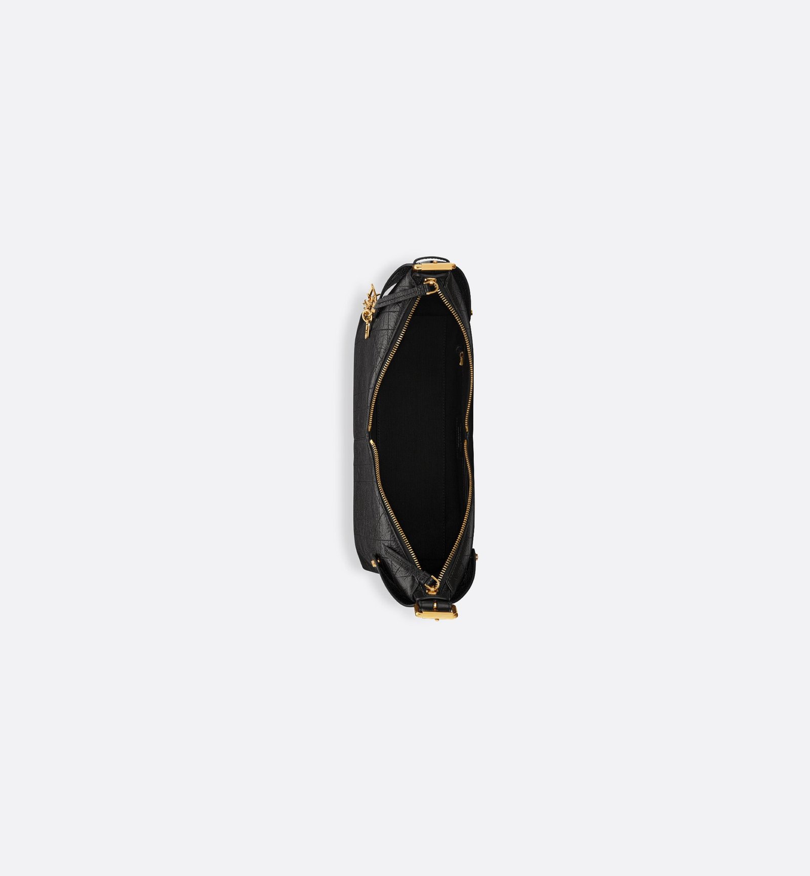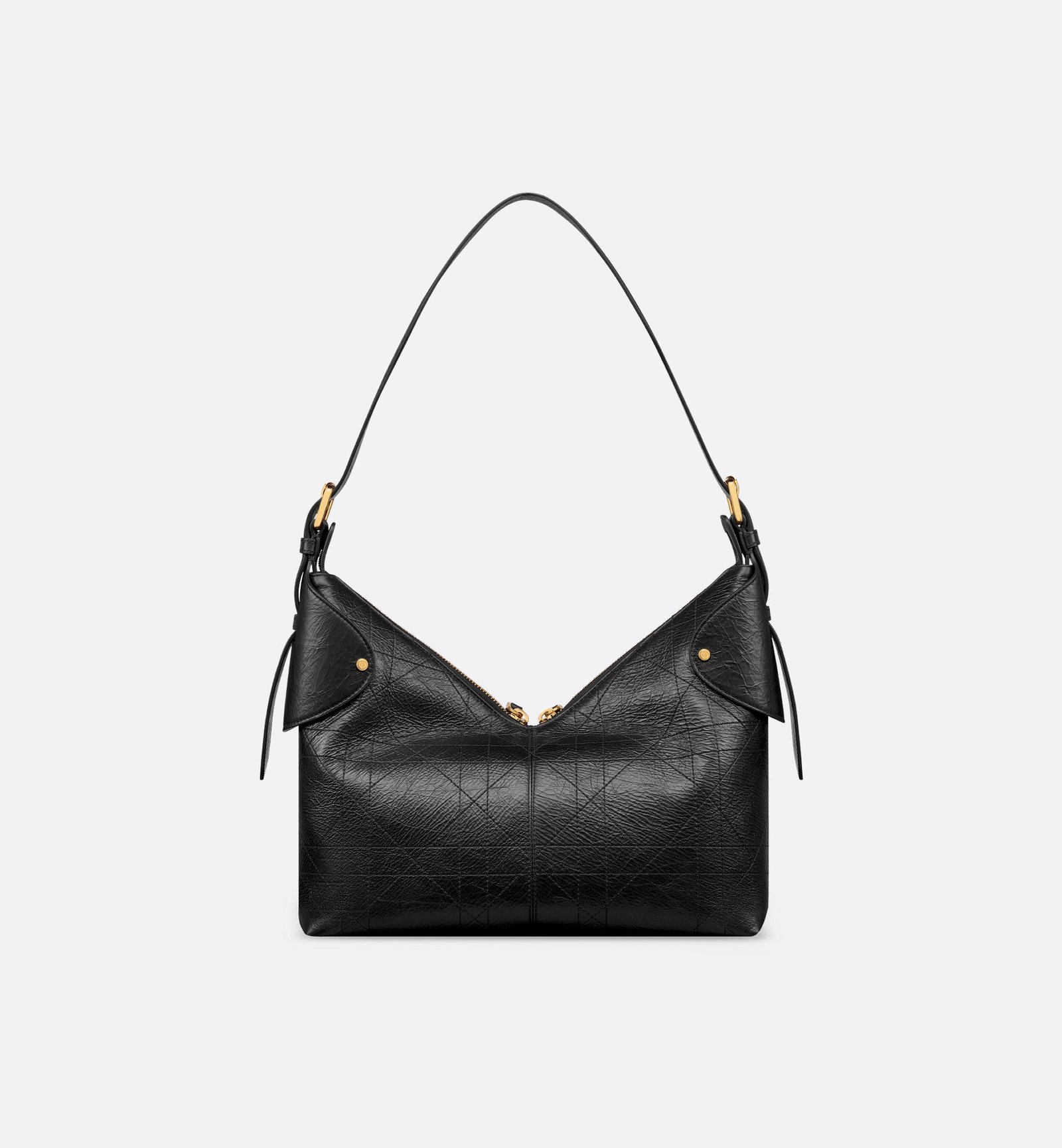- Crinkled Calfskin Leather with Flat Oversized Cannage: Meticulously crafted from black crinkled calfskin leather, the bag features Dior’s reimagined flat oversized Cannage quilting—an artistic take on the brand’s heritage that adds texture and sophistication.