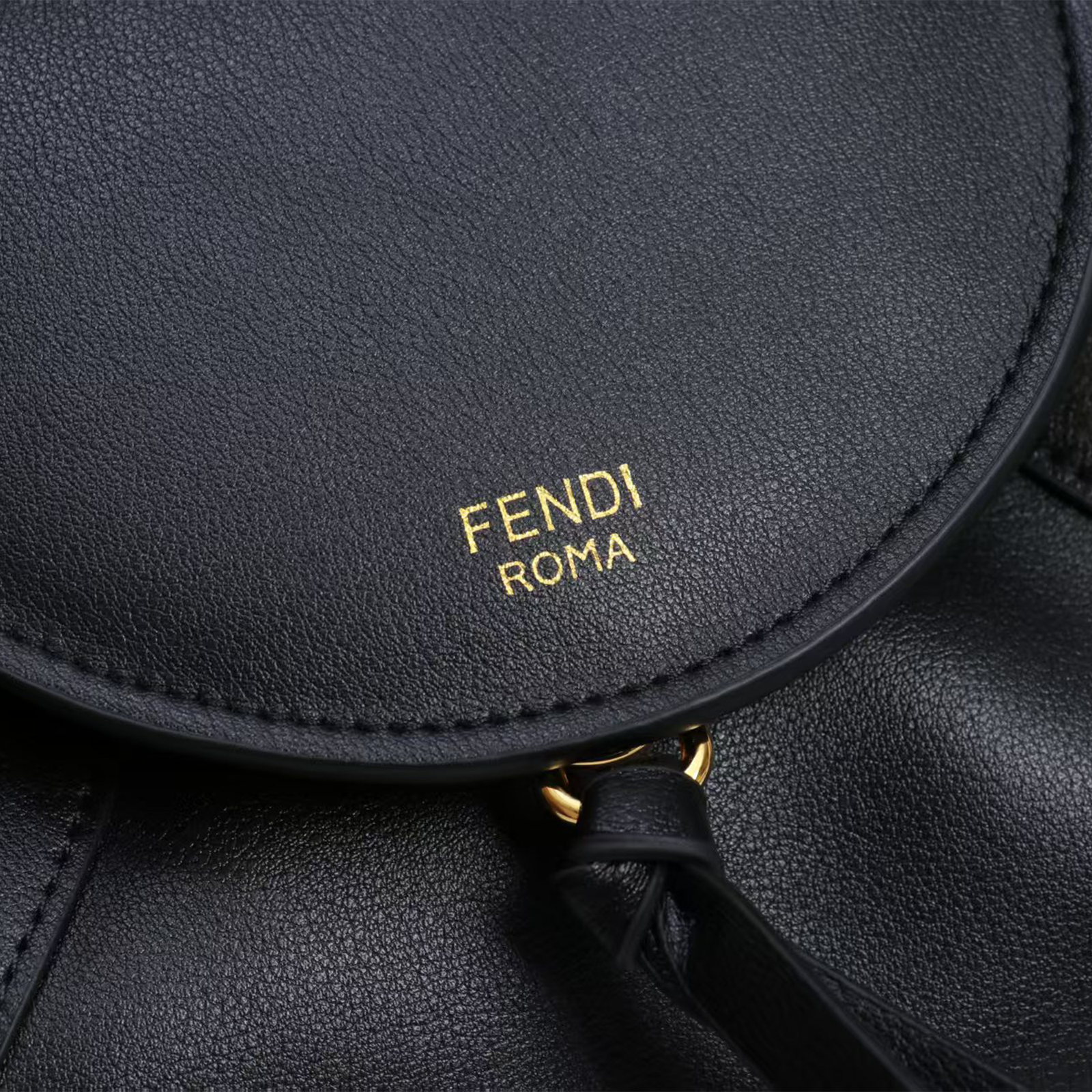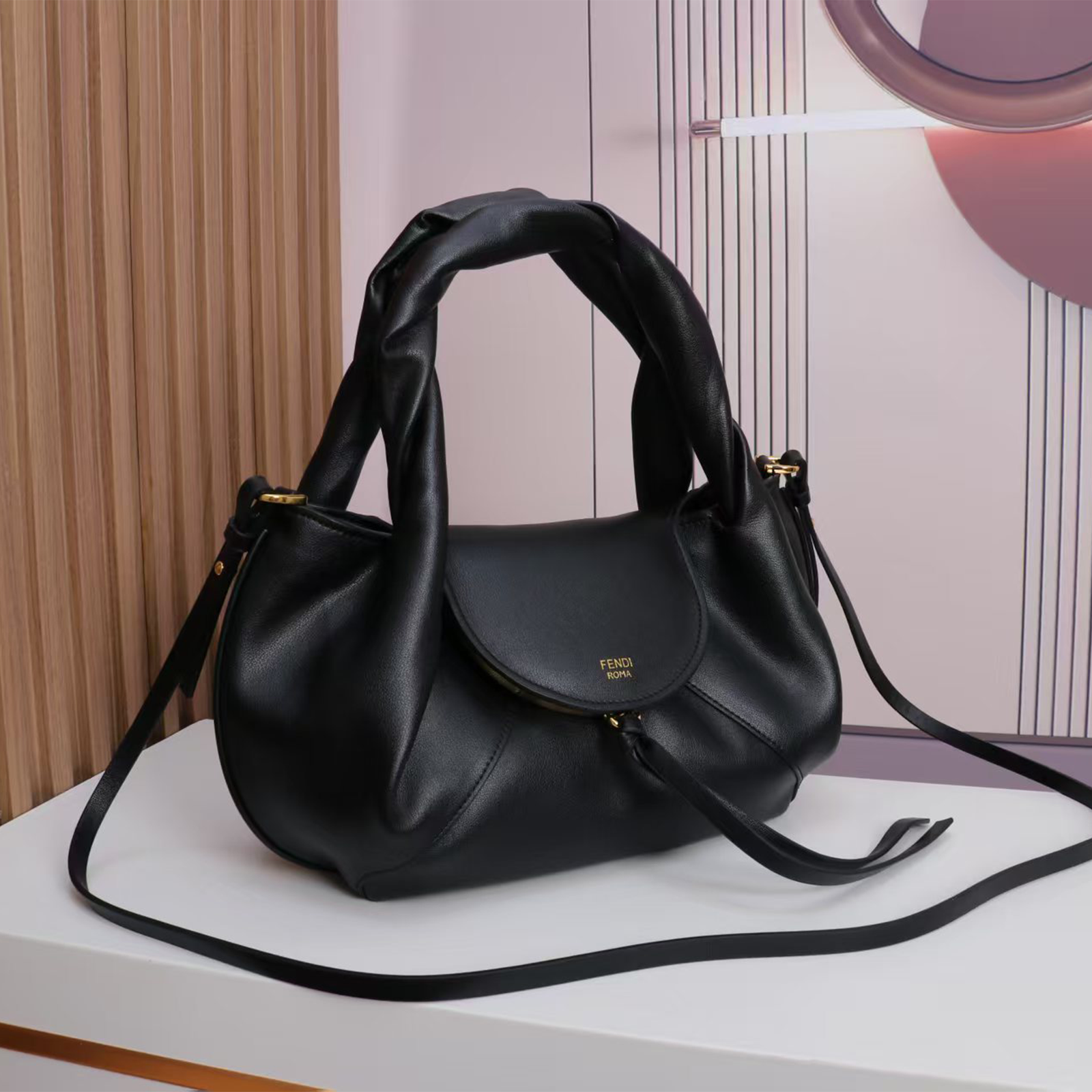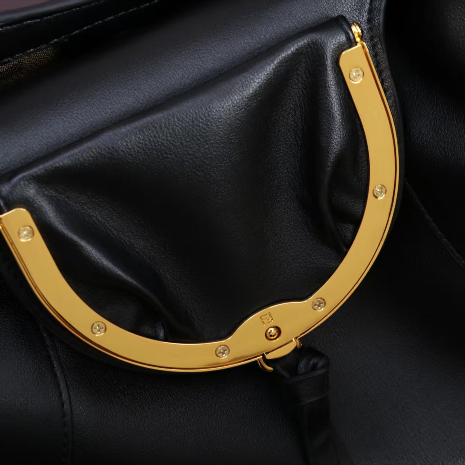 • Black Calfskin Leather & Signature Detailing: Meticulously crafted from supple black calfskin leather, featuring a sculptural twisted handle and a circular flap with gold-tone “FENDI ROMA” . Lined with tobacco-brown FF jacquard fabric, every detail exudes luxury and heritage.