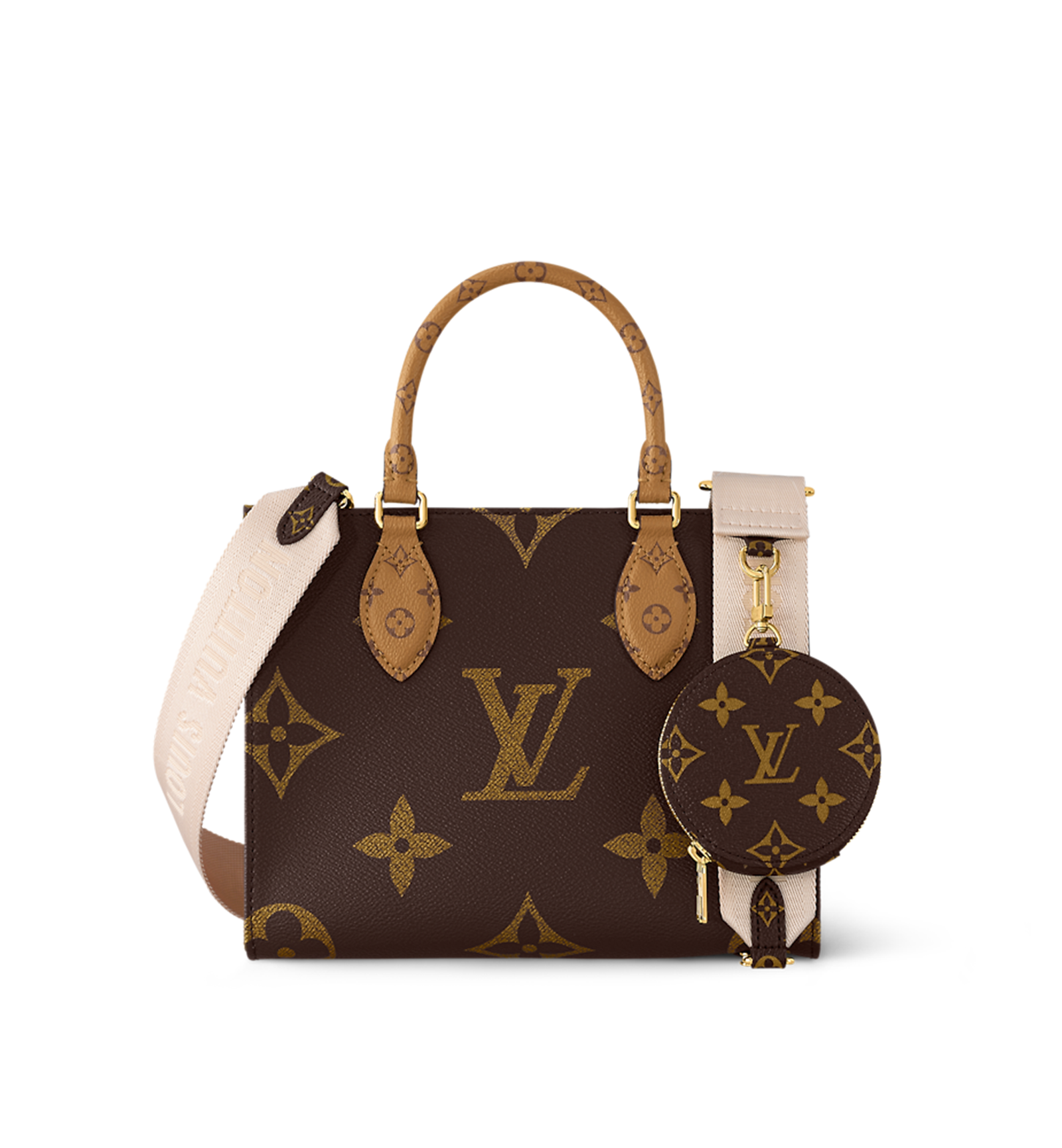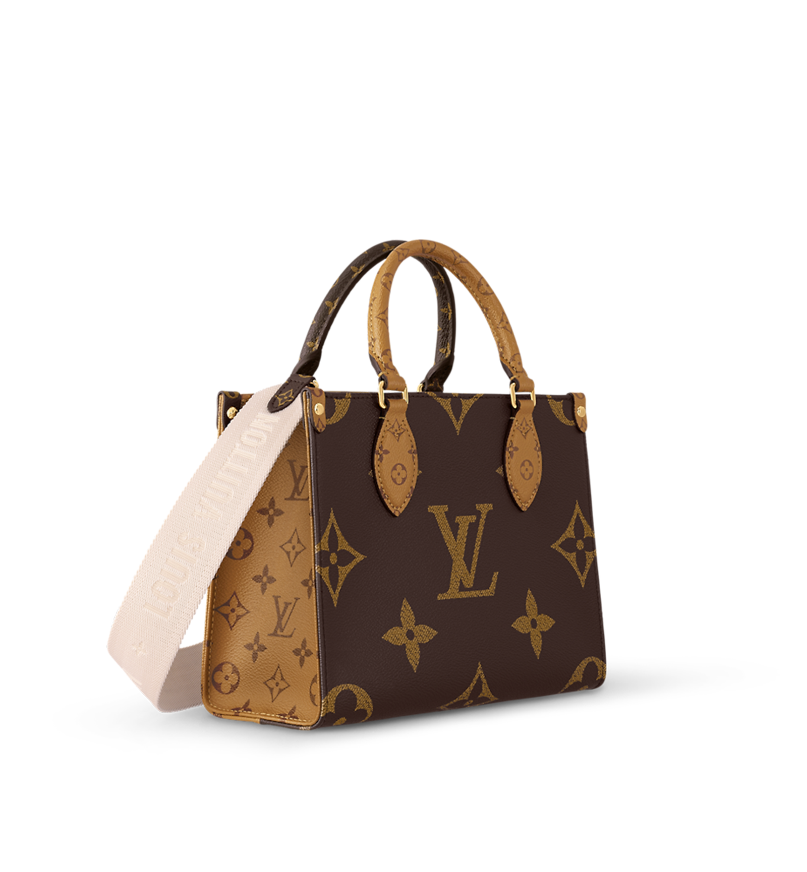 Elevate your style with the LOUIS VUITTON OnTheGo Small Handbag—a bold blend of the brand’s iconic Monogram and Monogram Reverse canvases, oversized pattern flair, and multi-functional design, perfect for the modern woman seeking luxury with everyday adaptability.